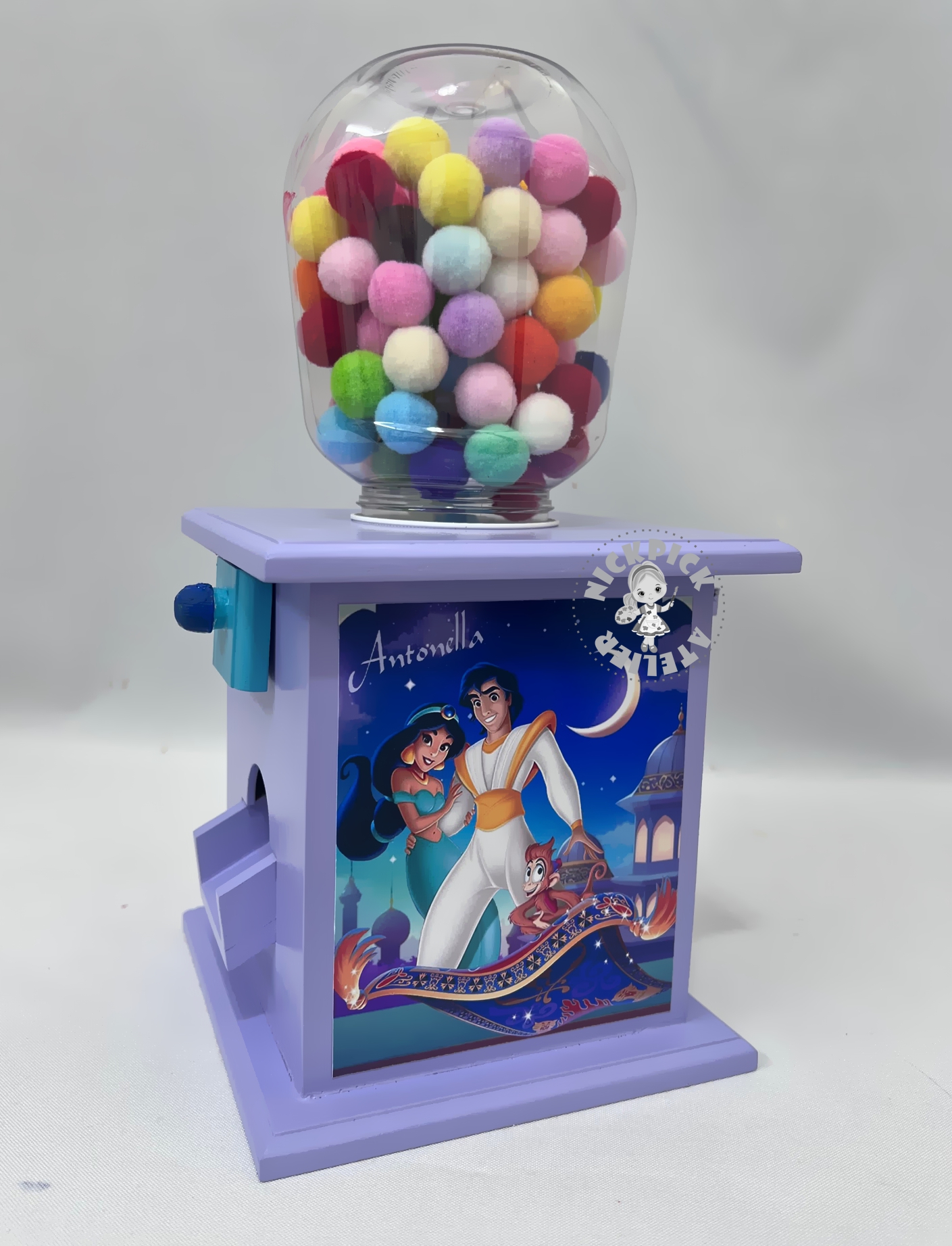 -Base da peça em MDF e pote destinado às balas, em plástico rígido. Um se encaixa no outro por rosqueamento.